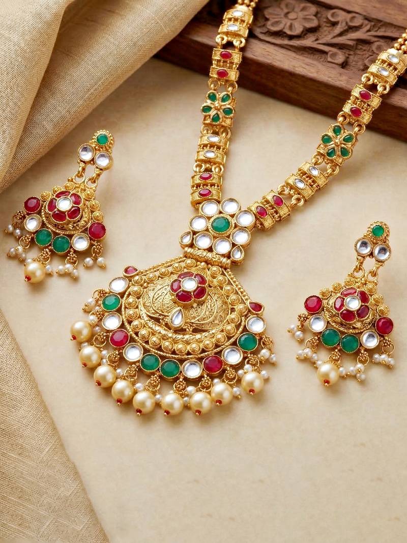 Lucky jewellery gold-plated ruby & green color traditional necklace set