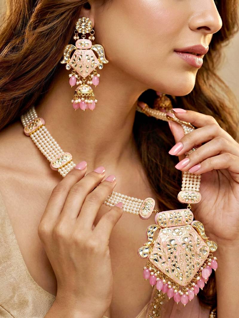 Traditional pink kundan & pearl long necklace set for women