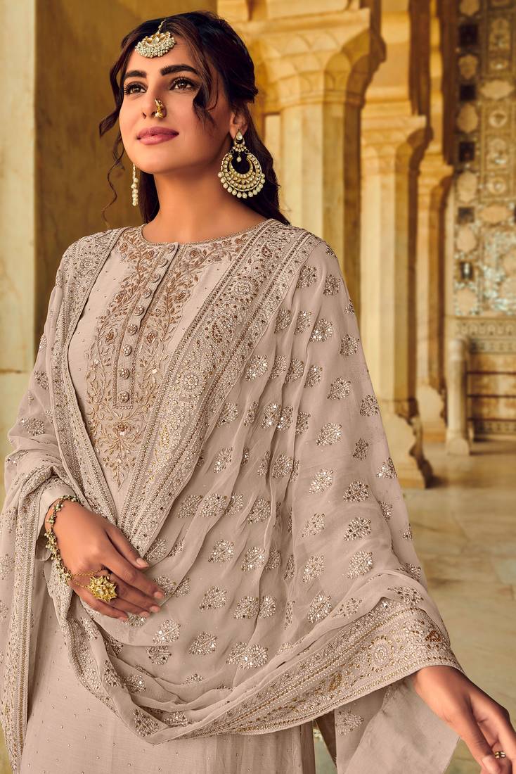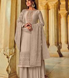 Fawn embroidered art silk semi stitched straight palazzo suit. up to 42" size
