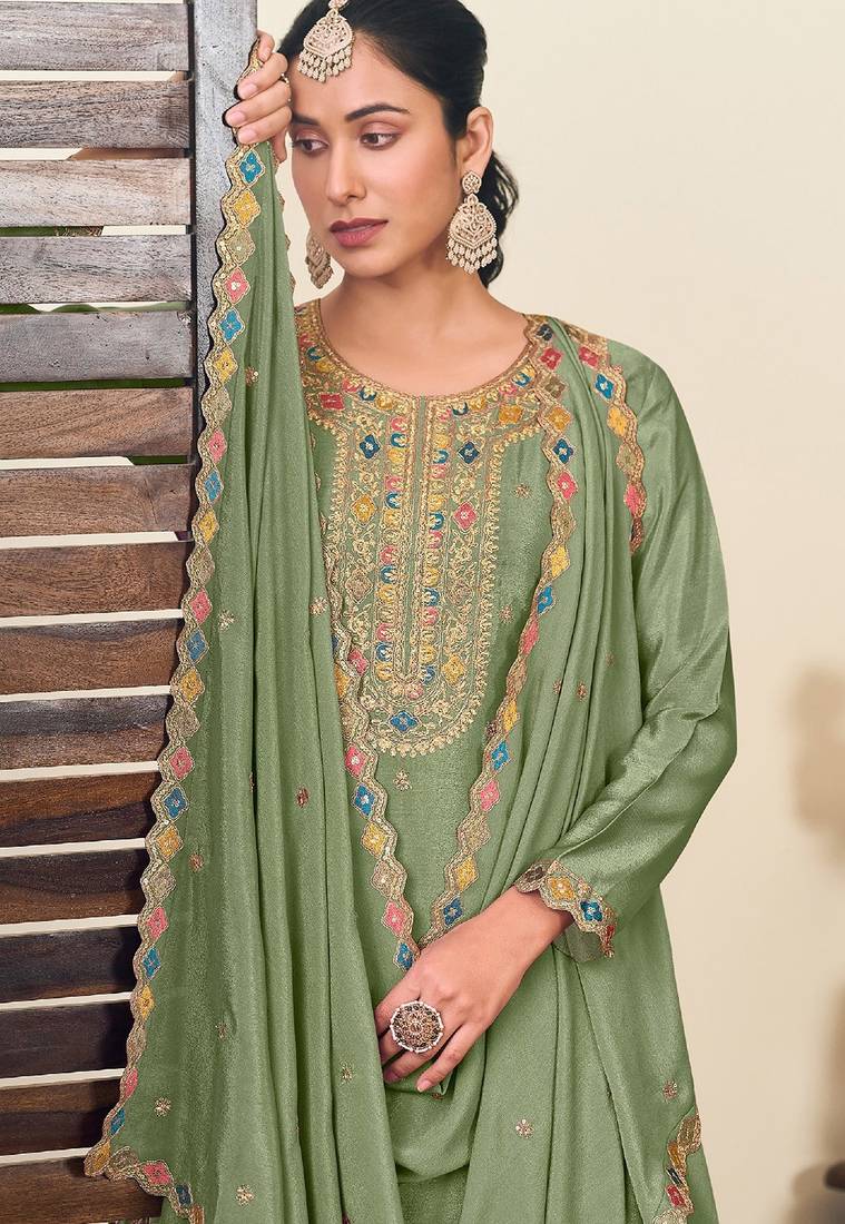 Green chiffon sequins work semi stitched salwar suits suits size up to 42