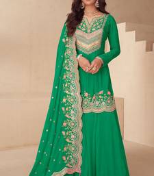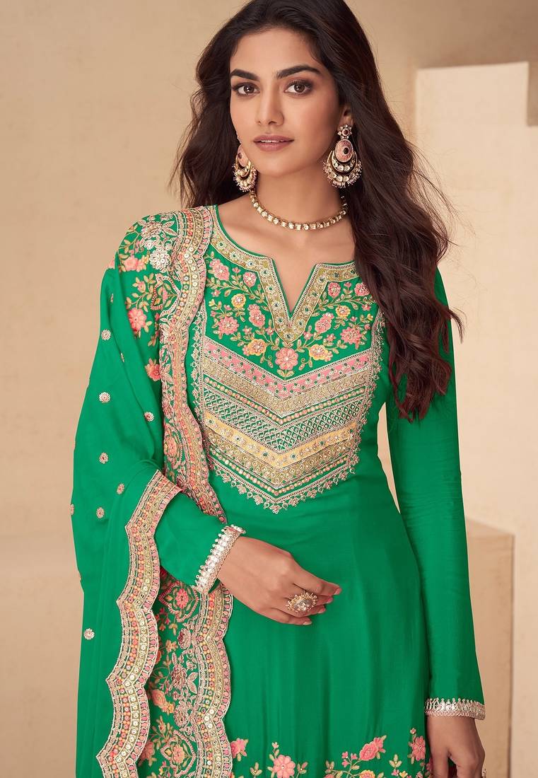 Green chiffon sequins work semi stitched salwar suits suits size up to 42