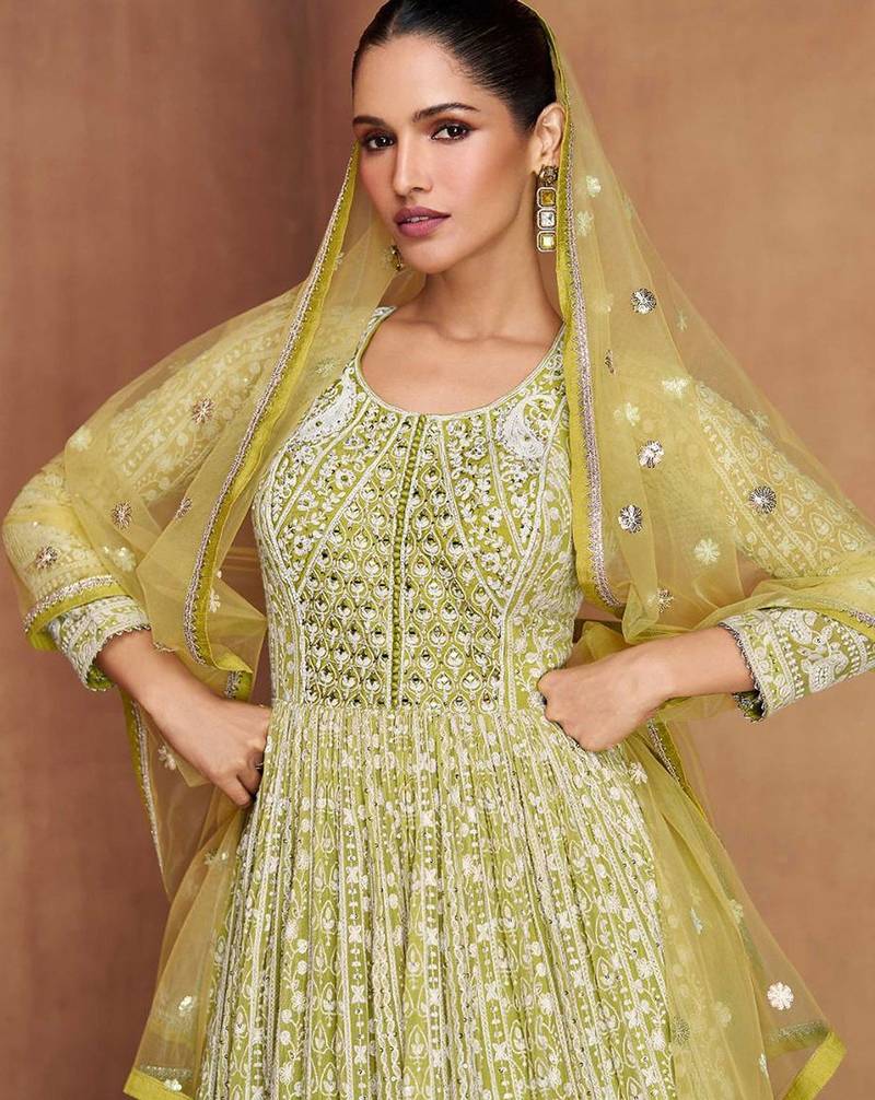 Mustard georgette hand embroidery semi stitched salwar suits suits size up to 42
