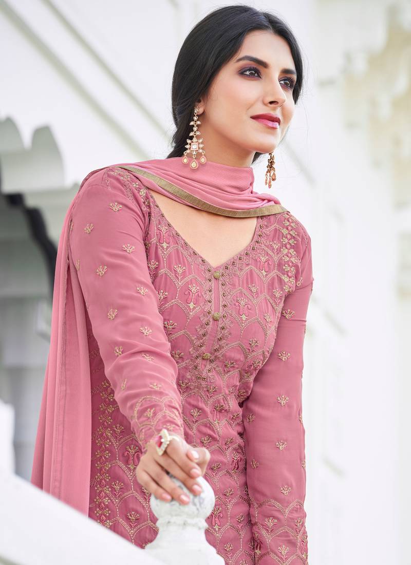 | Product Description | Pink Embroidered Georgette Semi Stitched Straight Suit Up To 42 Size |