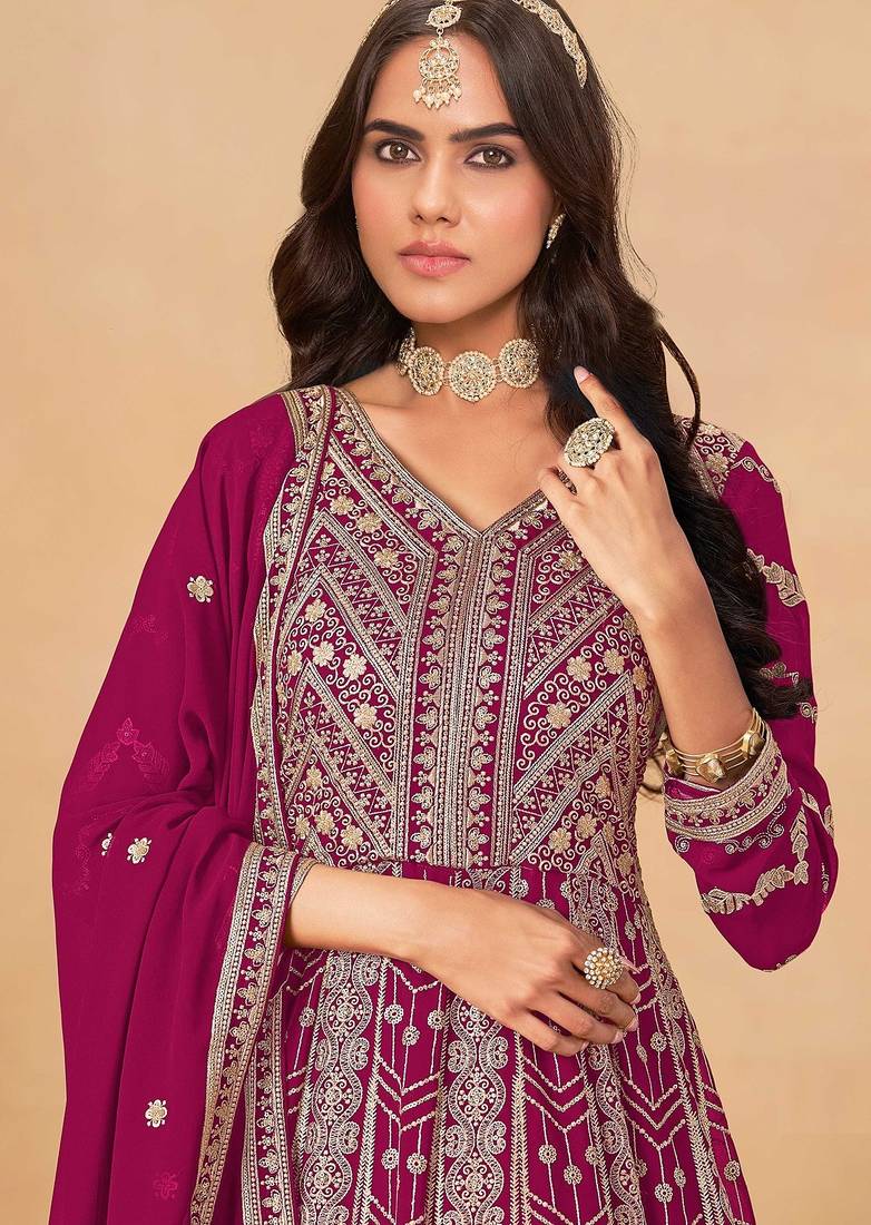 | • | Dupatta | : | Color- Rani / Fabric- Faux Georgette |