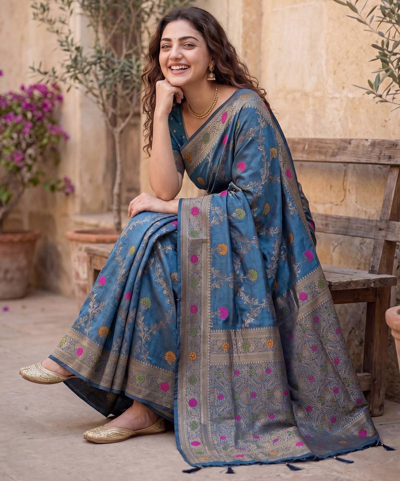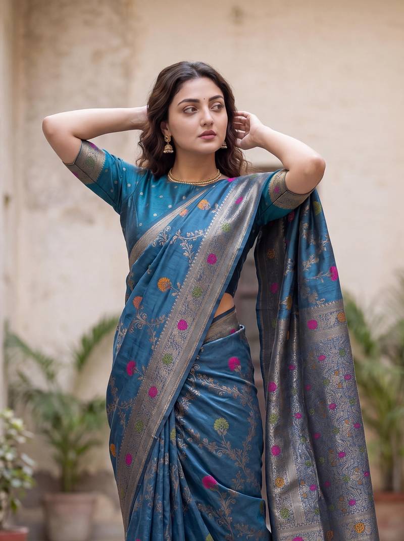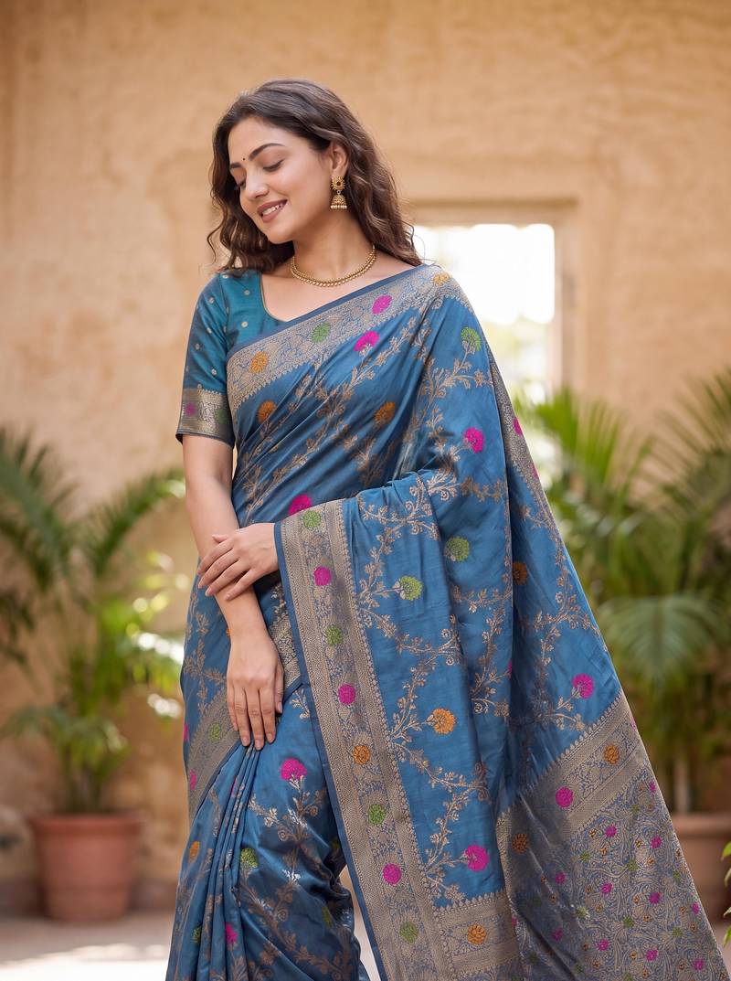 | Product Description | Bring Elegance And Tradition Together With This Stunning Blue Dola Silk Saree, Designed For Festive And Special Occasions. Crafted From Premium Quality Dola Silk Fabric, This Saree Offers A Smooth, Lightweight, And Comfortable Drape That Enhances Your Graceful Appearance. The Highlight Of This Saree Is Its Exquisite Silver Zari Weaving Combined With Beautiful Multicolor Thread Woven Work, Giving It A Rich And Luxurious Ethnic Look. The Intricate Craftsmanship Adds Depth And Charm, Making It Perfect For Weddings, Festivals, Receptions, And Cultural Celebrations. |