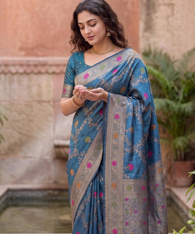 Blue dola silk saree with silver zari & multicolor thread woven work | festive wear saree for women