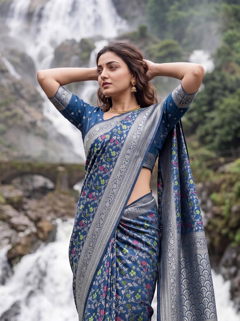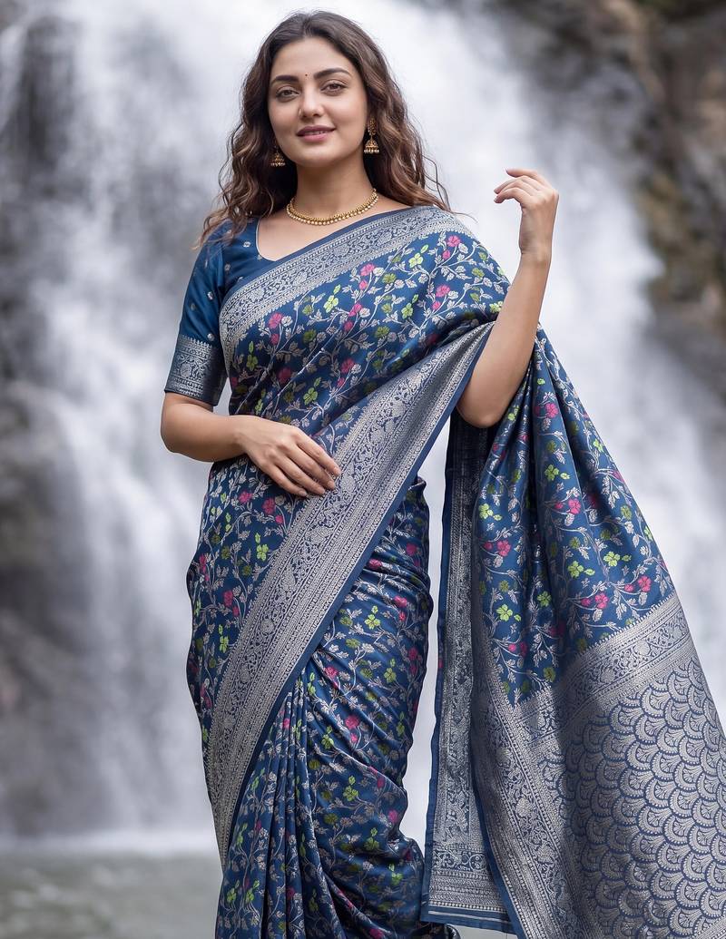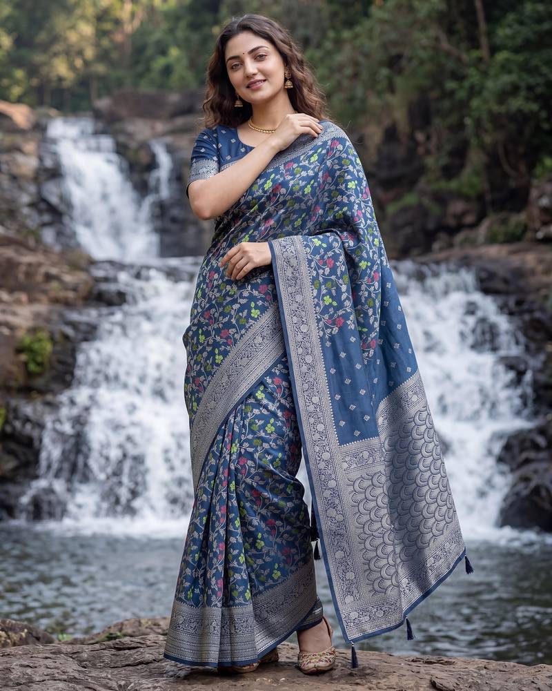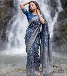 Blue dola silk saree with silver zari & multicolor woven work | festive wear