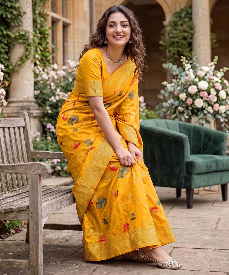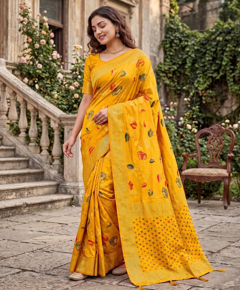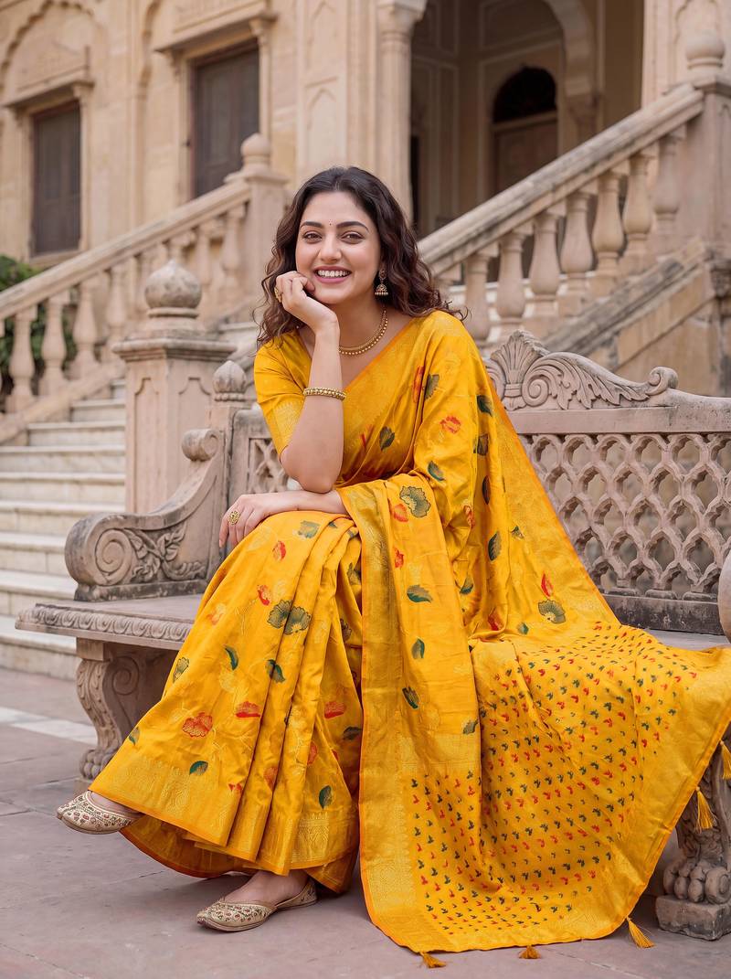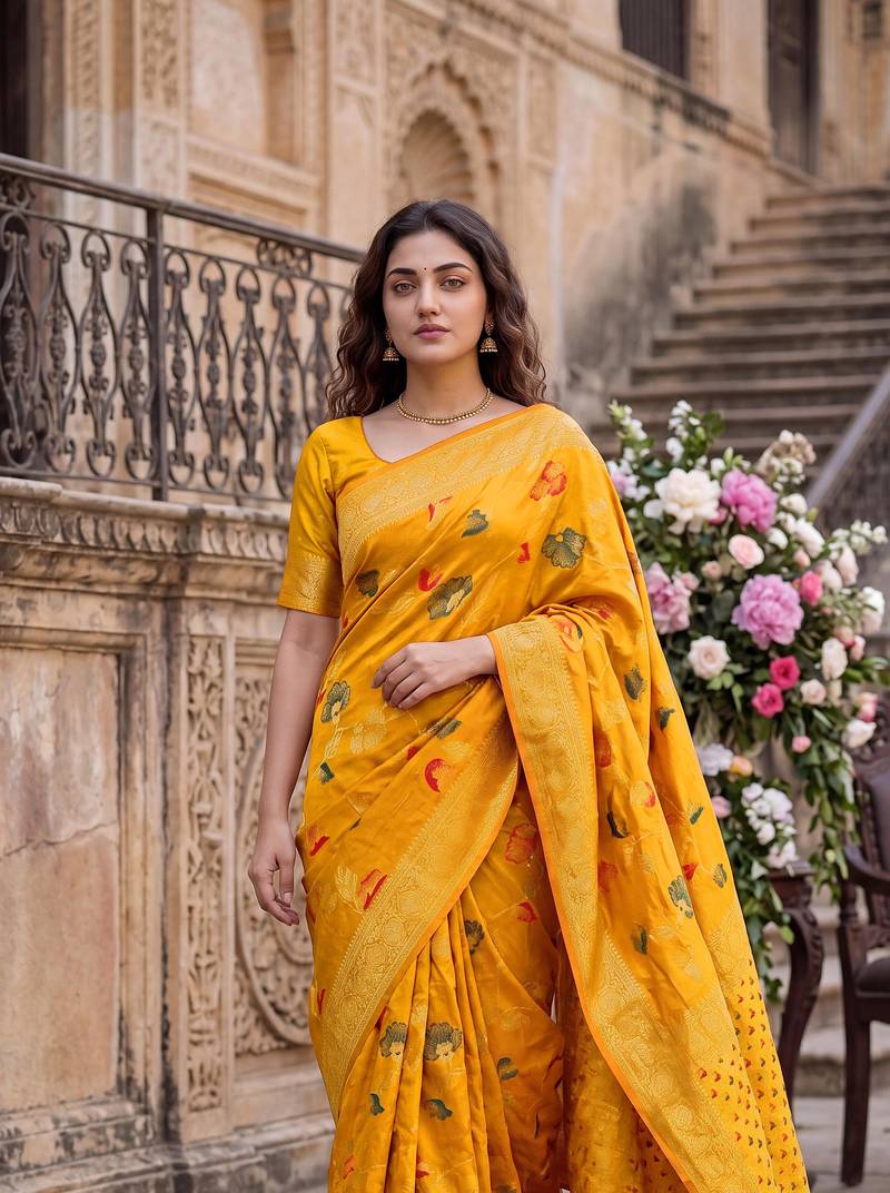 | Product Name | Mustard Dola Silk Saree With Silver Zari & Multicolor Thread Woven Work | Festive Wear | |