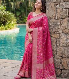 Rani pink raw silk saree with silver zari & multicolor thread woven work | festive wear
