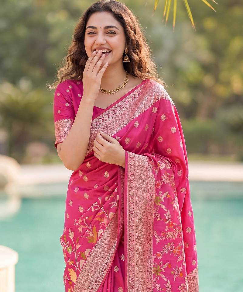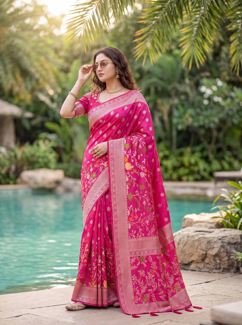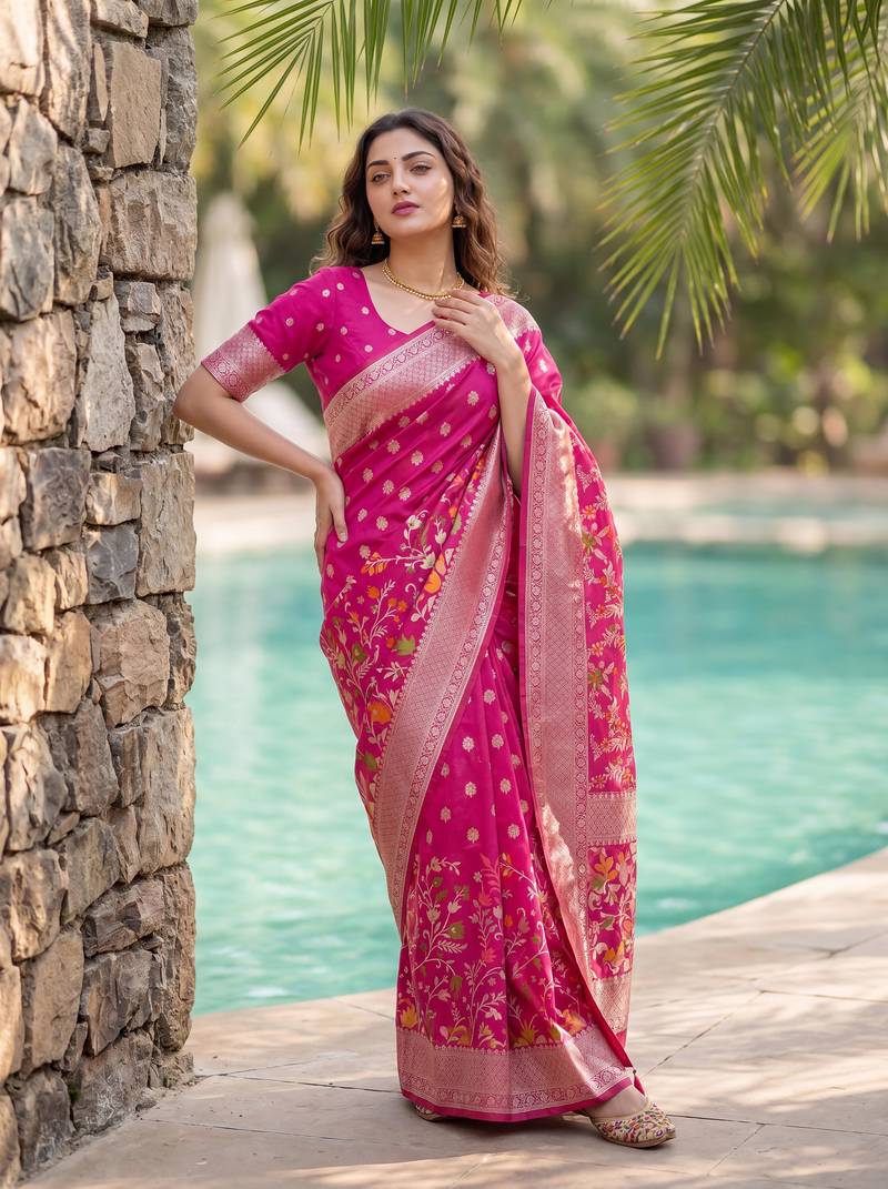 | Product Name | Rani Pink Raw Silk Saree With Silver Zari & Multicolor Thread Woven Work | Festive Wear | |