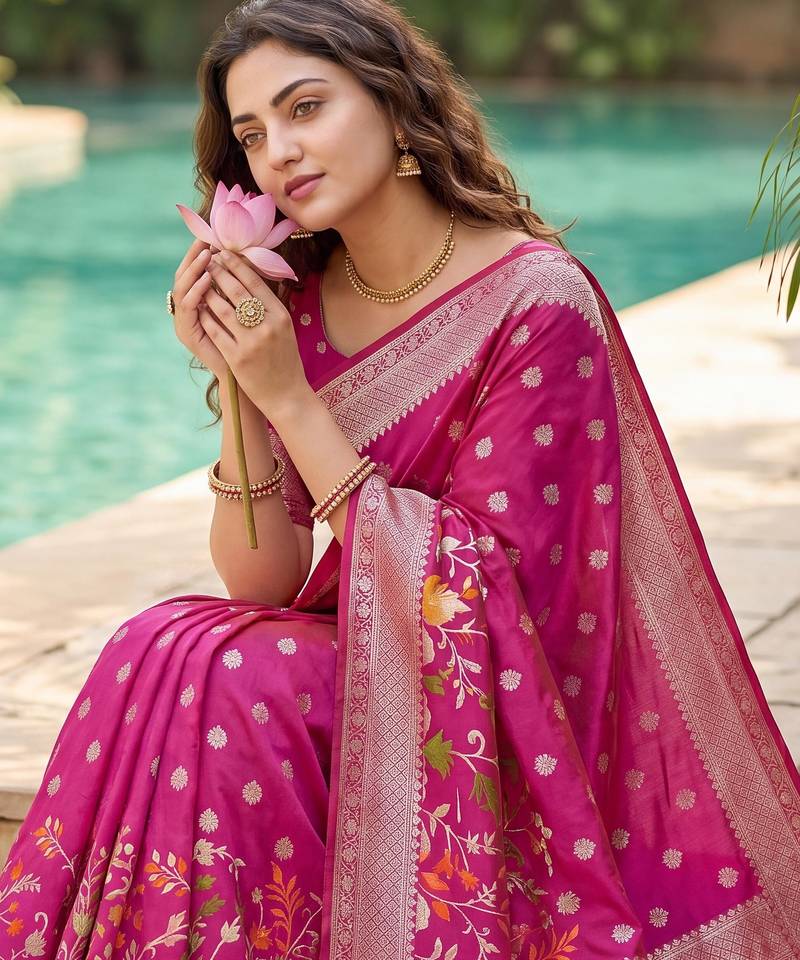 | • | Saree | : | Color- Rani Pink / Fabric- Raw Silk |
