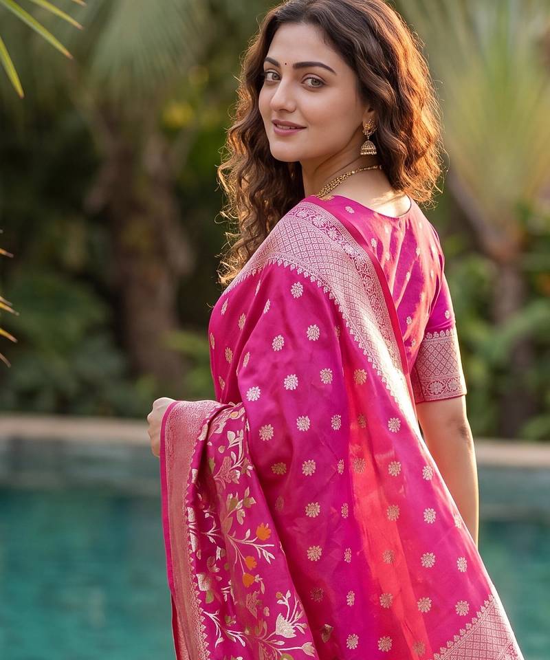 | Product Description | Premium Raw Silk Saree Crafted With Intricate Silver Zari And Multicolor Thread Woven Motifs. The Rich Rani Pink Base Combined With Elegant Border Detailing Gives A Luxurious And Festive Appeal. Perfect For Weddings, Festive Occasions, And Traditional Celebrations. Saree Length: 6.3 Meters. Blouse: Matching Running Blouse Piece Included (0.8 Meters, Unstitched). Package Contains: 1 Saree With Blouse Piece. |