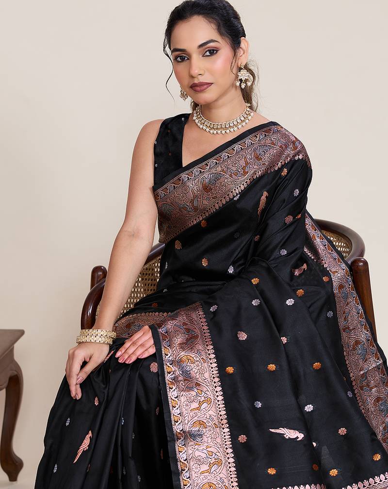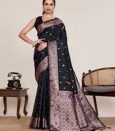 Black jacquard zari woven saree wedding designer heavy border with blouse ethnic party wear