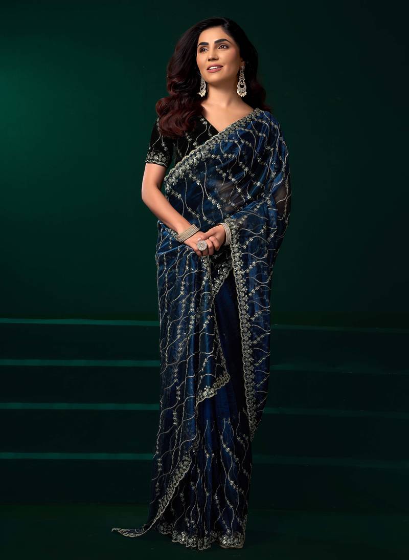 Blue sequins embroidered net designer party wear saree with unstitched velvet blouse