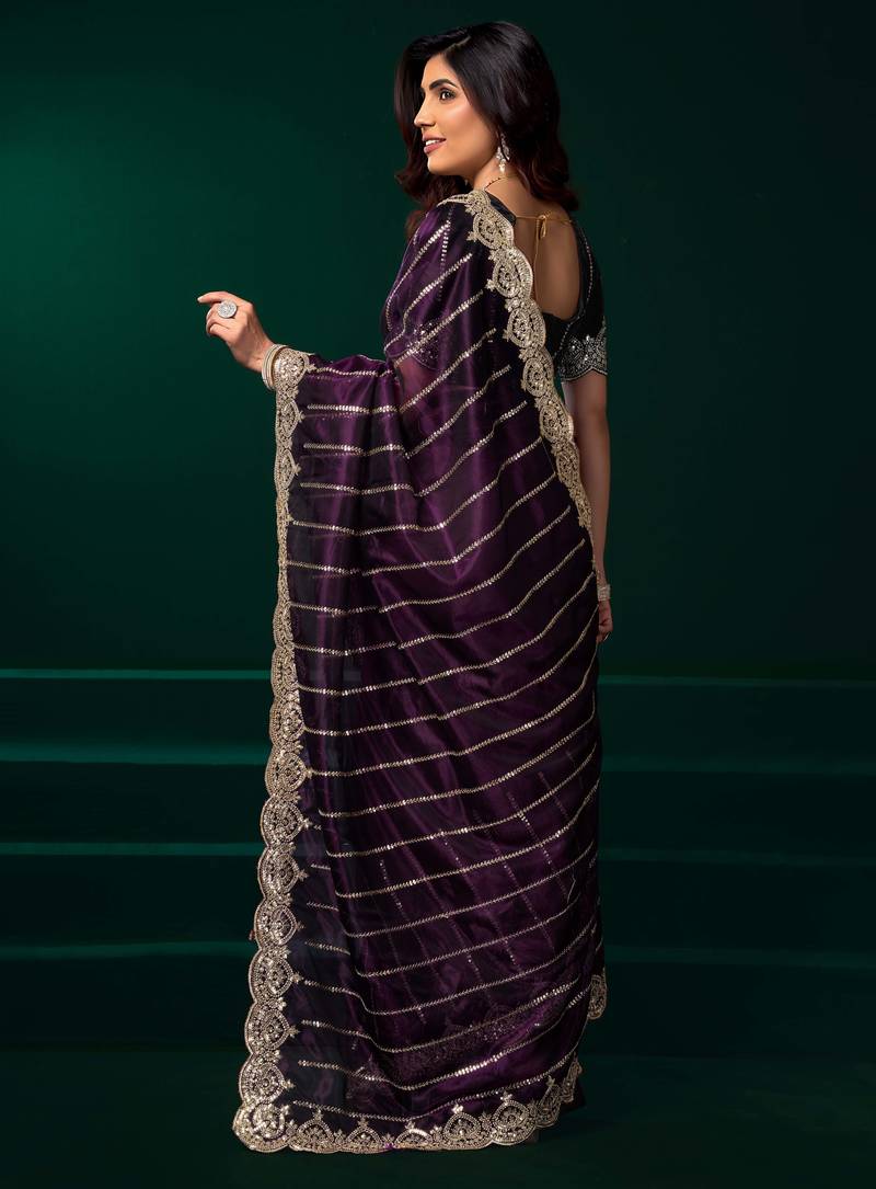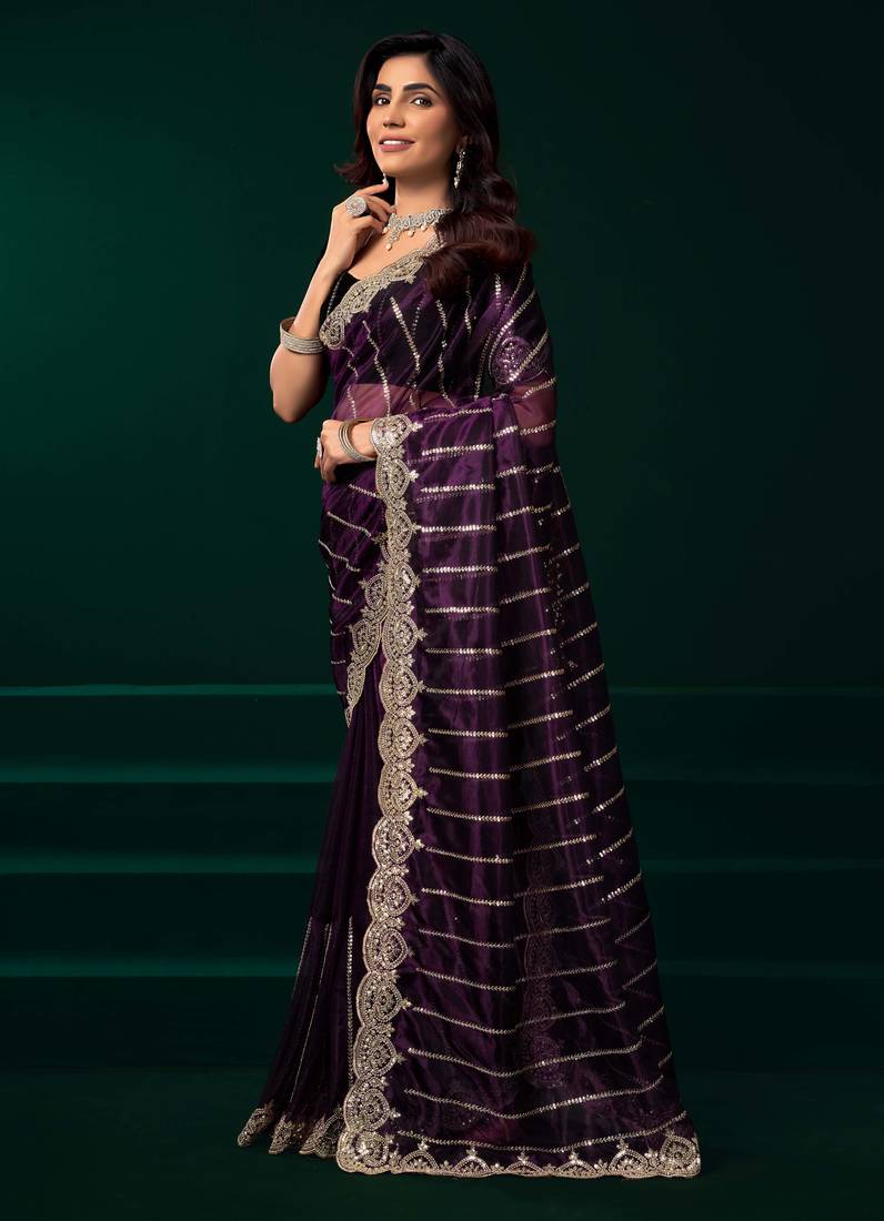 | Product Description | • Elegant Violet Net Saree With Heavy Sequins Embroidery And Scalloped Border Design