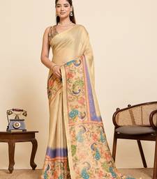 Cream linen floral printed zari woven saree traditional wedding wear with blouse style