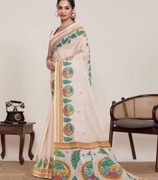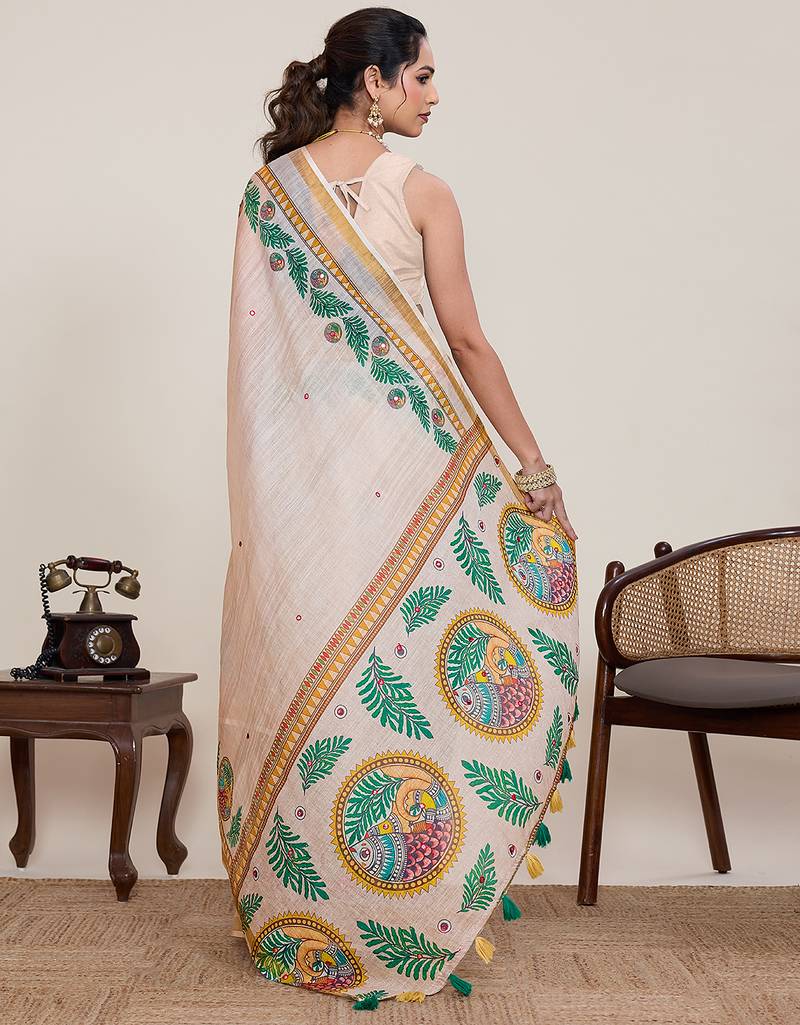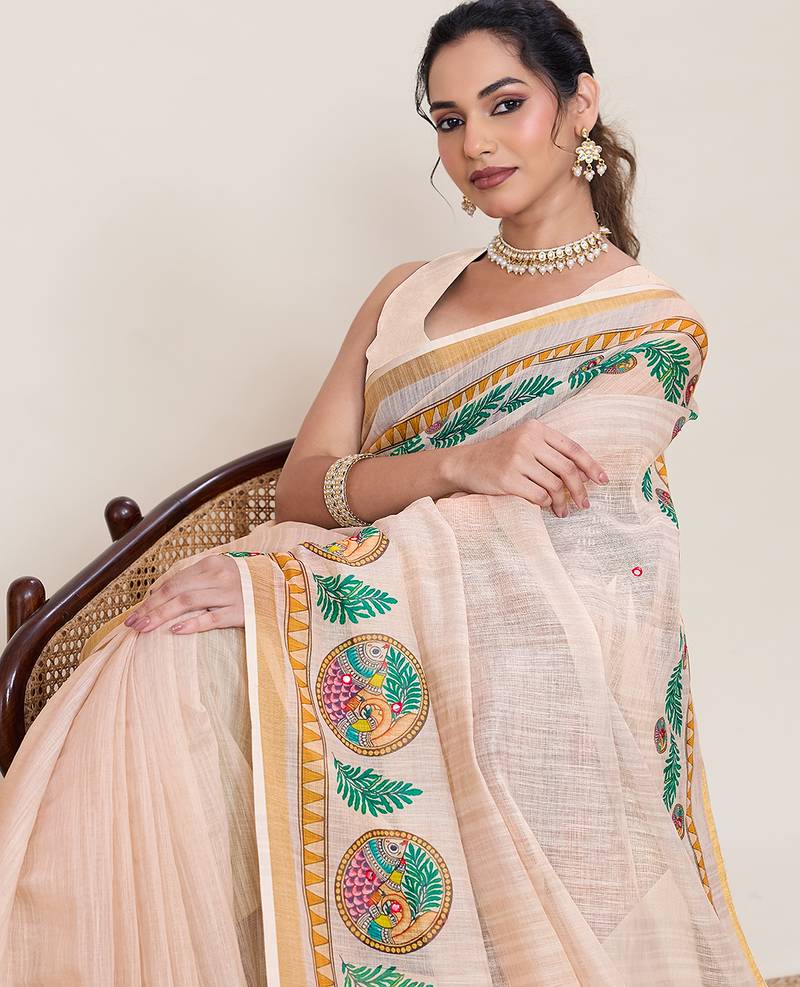Cream linen saree printed pallu traditional wedding wear saree with blouse elegant style