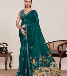 Green linen saree printed designer wedding wear traditional saree with blouse piece
