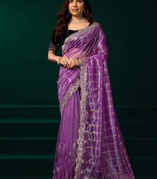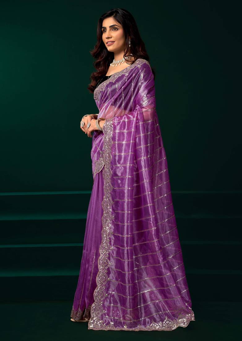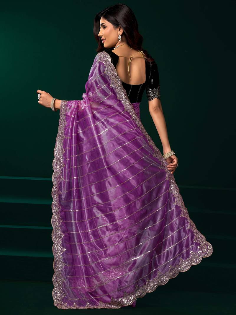 | Product Description | • Elegant Violet Net Saree With Heavy Sequins Embroidery And Scalloped Border Design