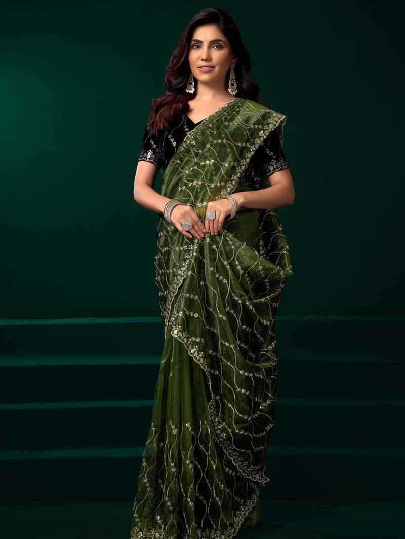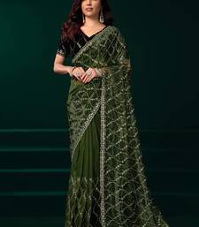 Light green net sequins work traditional designer saree with unstitched velvet blouse
