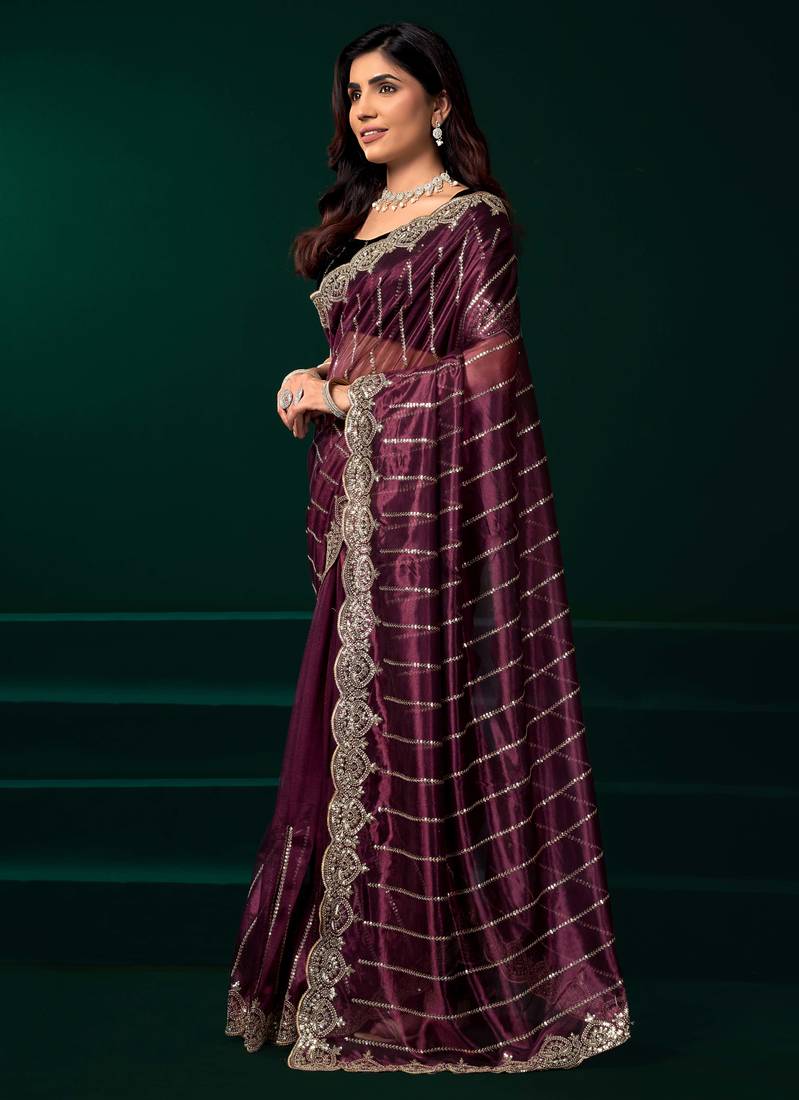 | Product Description | • Elegant Violet Net Saree With Heavy Sequins Embroidery And Scalloped Border Design