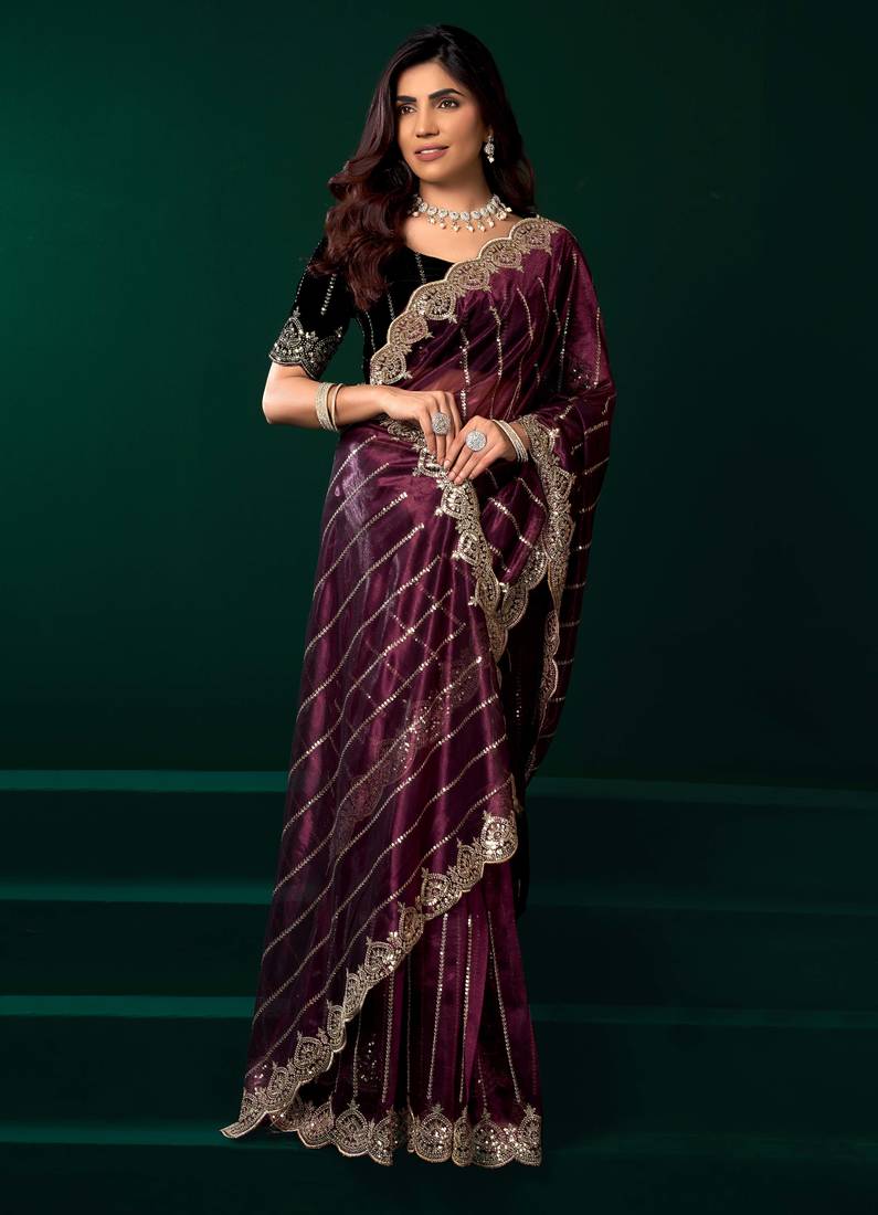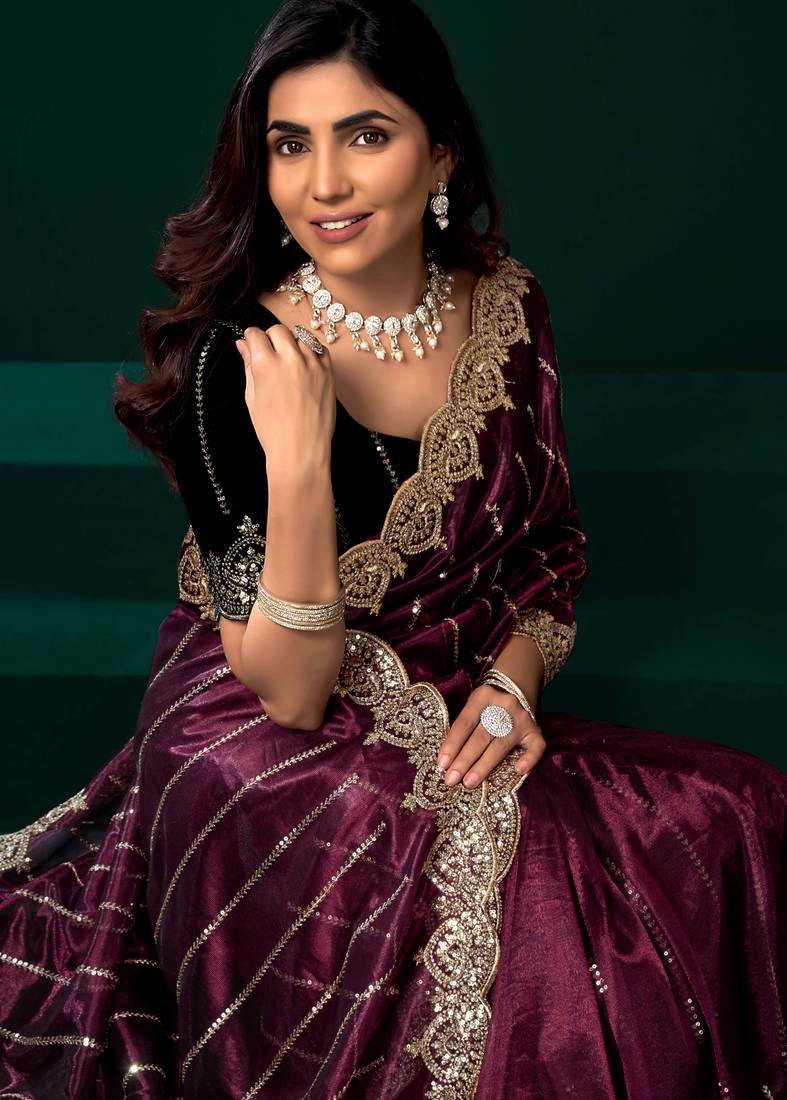 Maroon net heavy sequins designer saree party wear with velvet unstitched blouse