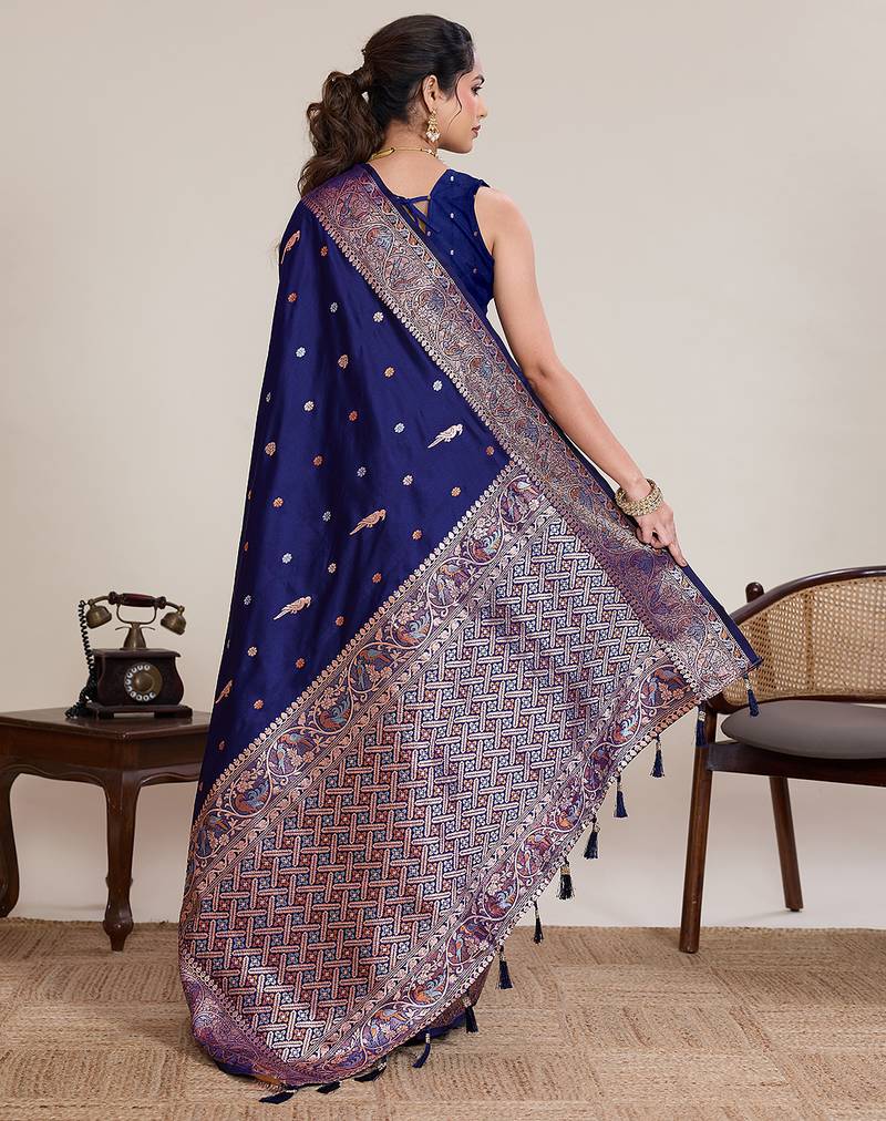 Navy jacquard silk saree traditional zari work heavy pallu party wedding saree with blouse