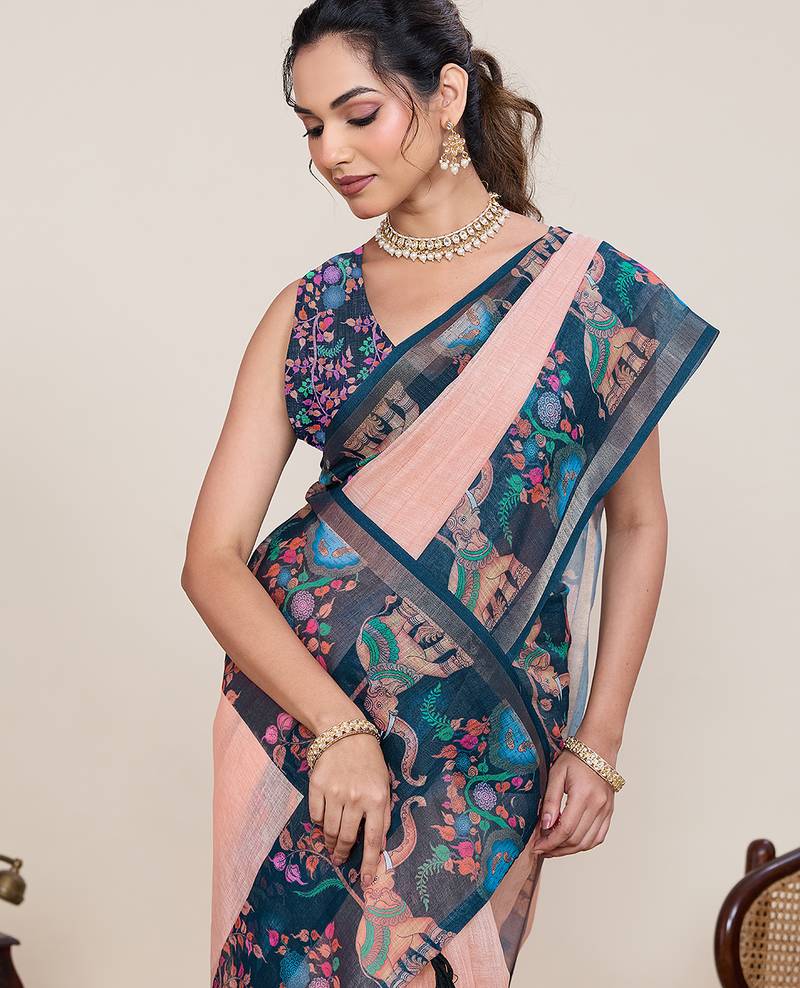 | Product Name | Peach Linen Floral Printed Saree With Blouse Contrast Border Traditional Ethnic Festival Wear | |