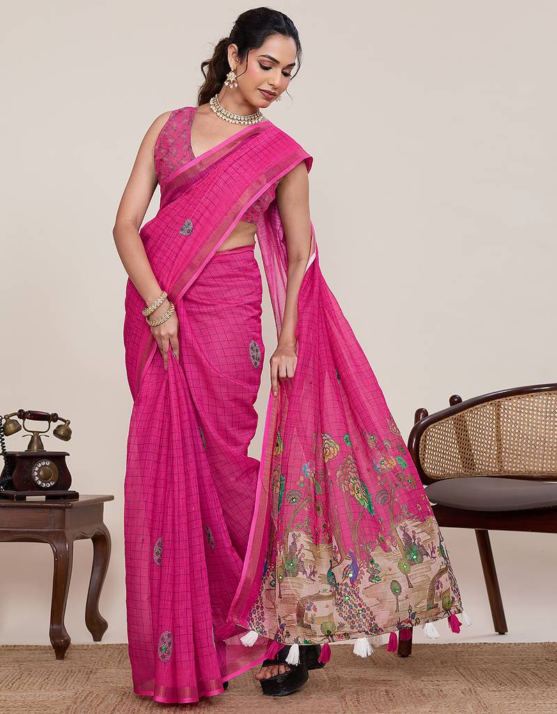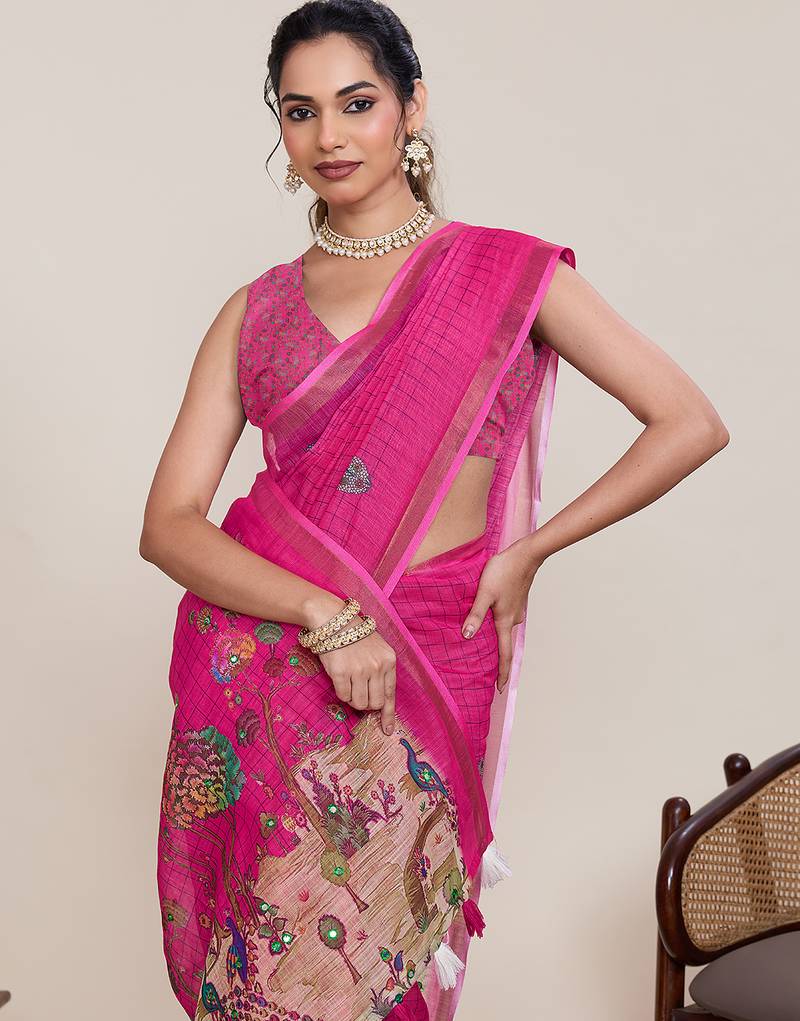 | Product Name | Pink Linen Printed Saree Designer Border Wedding Traditional Saree With Blouse Set | |