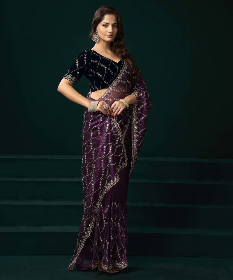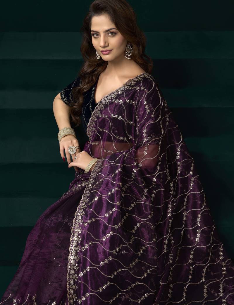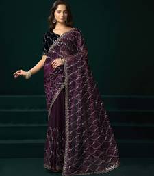 Purple traditional net sequins work saree with unstitched velvet blouse