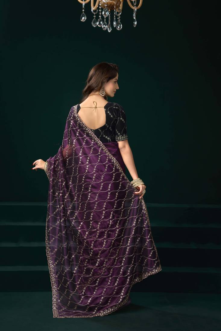 | Product Description | • Elegant Violet Net Saree With Heavy Sequins Embroidery And Scalloped Border Design
