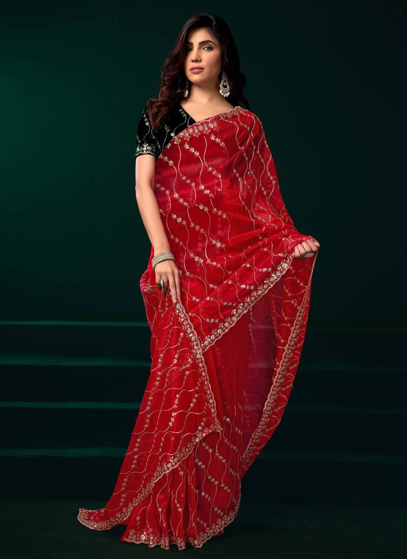 Red embroidered net festival party wear saree with velvet blouse piece