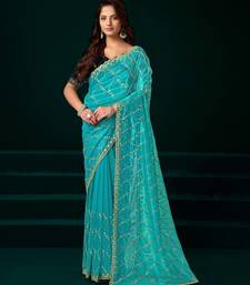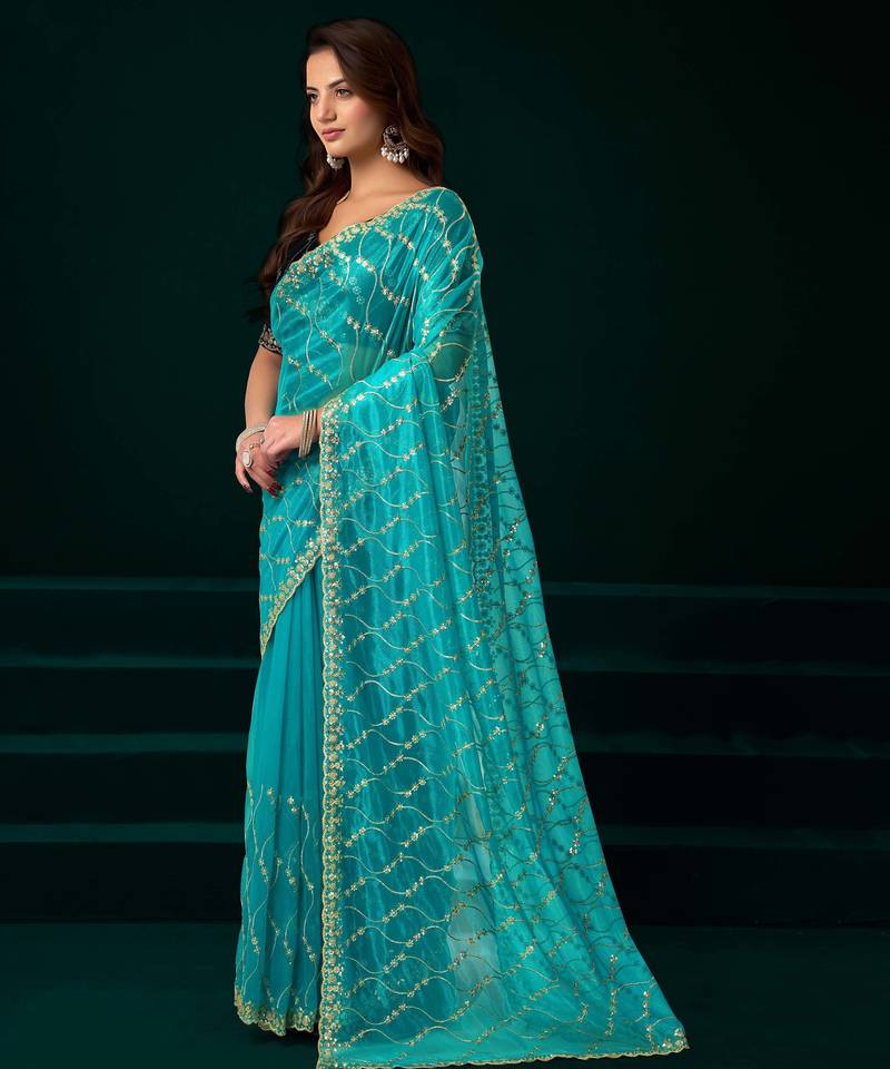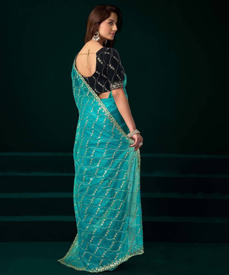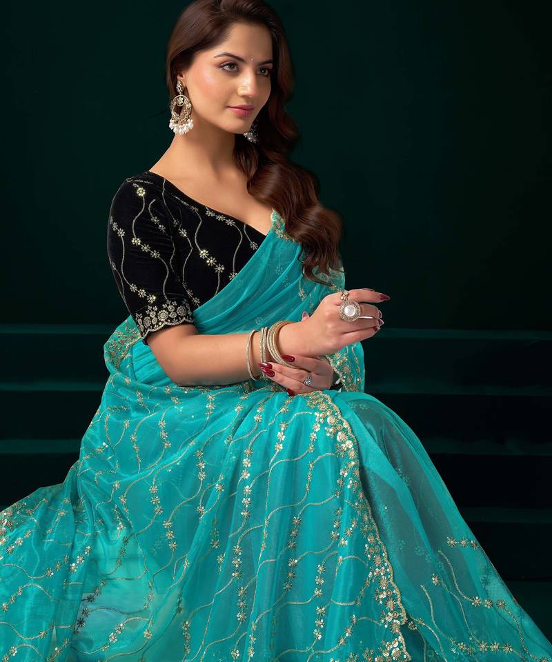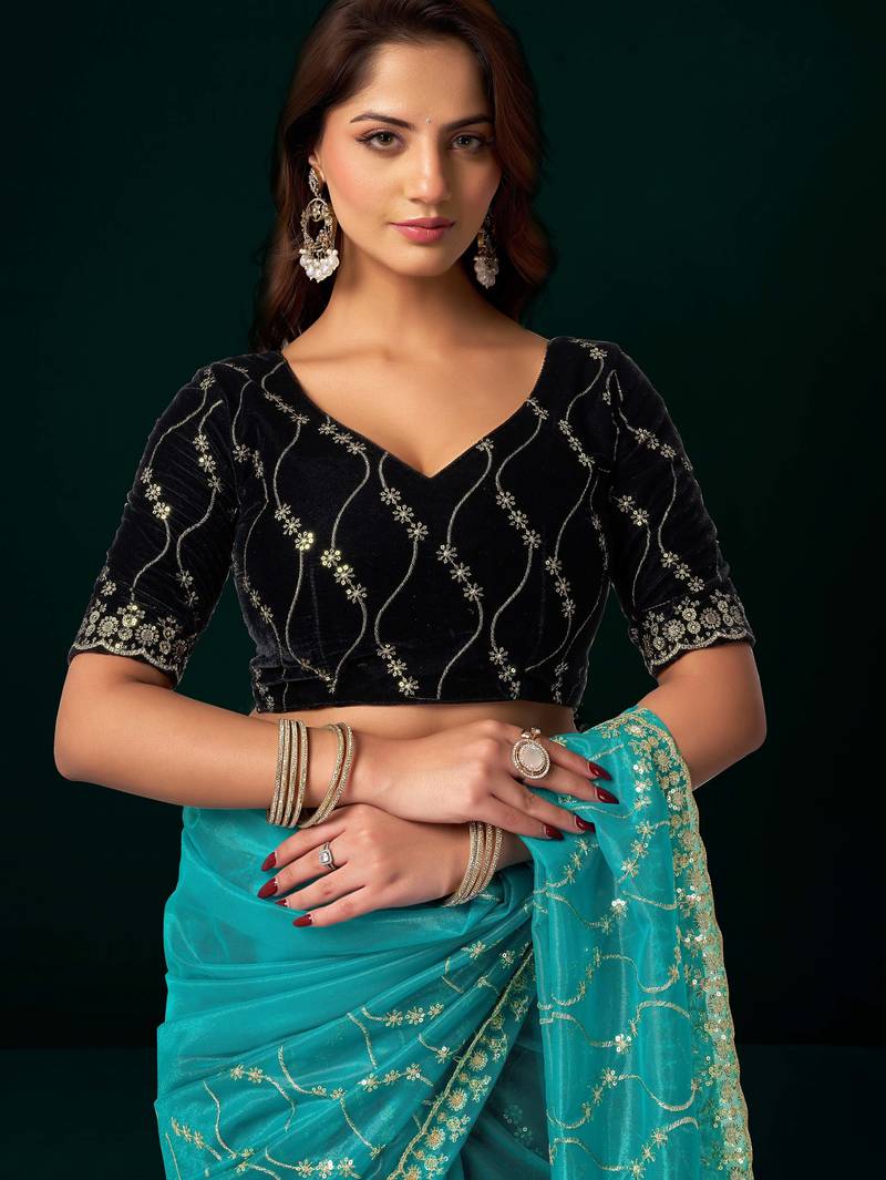 Turquoise net designer saree with sequins embroidery and velvet unstitched blouse