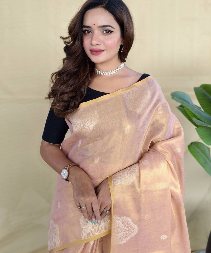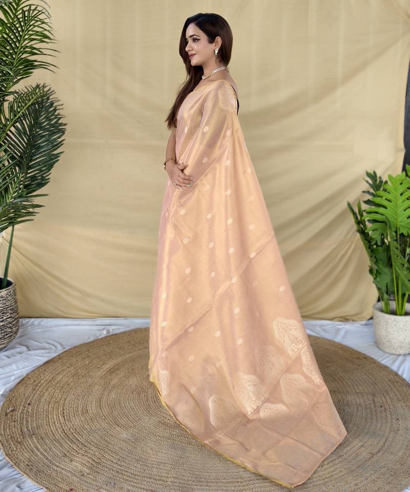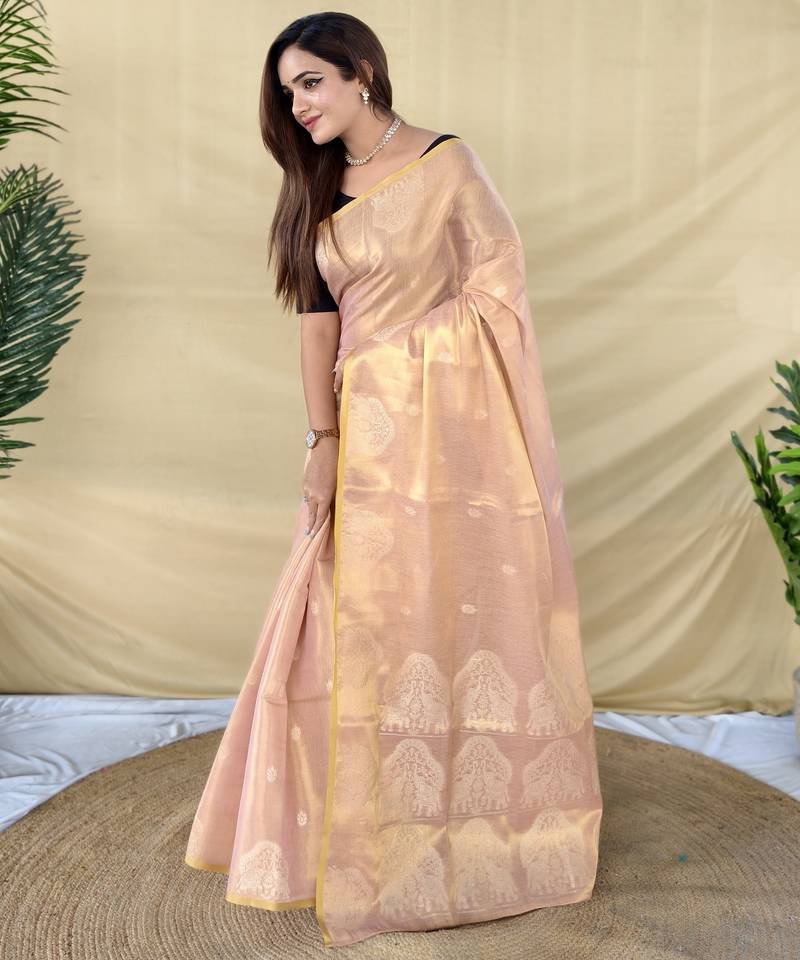 | Product Name | Light Pink Zari Tissue Weaving Saree With All Over Elephant Pattern Motifs On Border | |