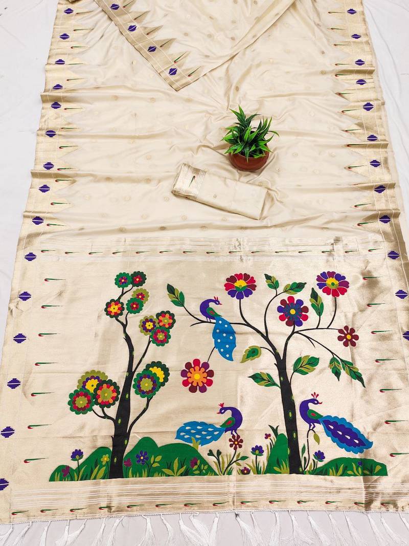 Off white faux banarasi silk saree with paithani rich weaved pallu and blouse
