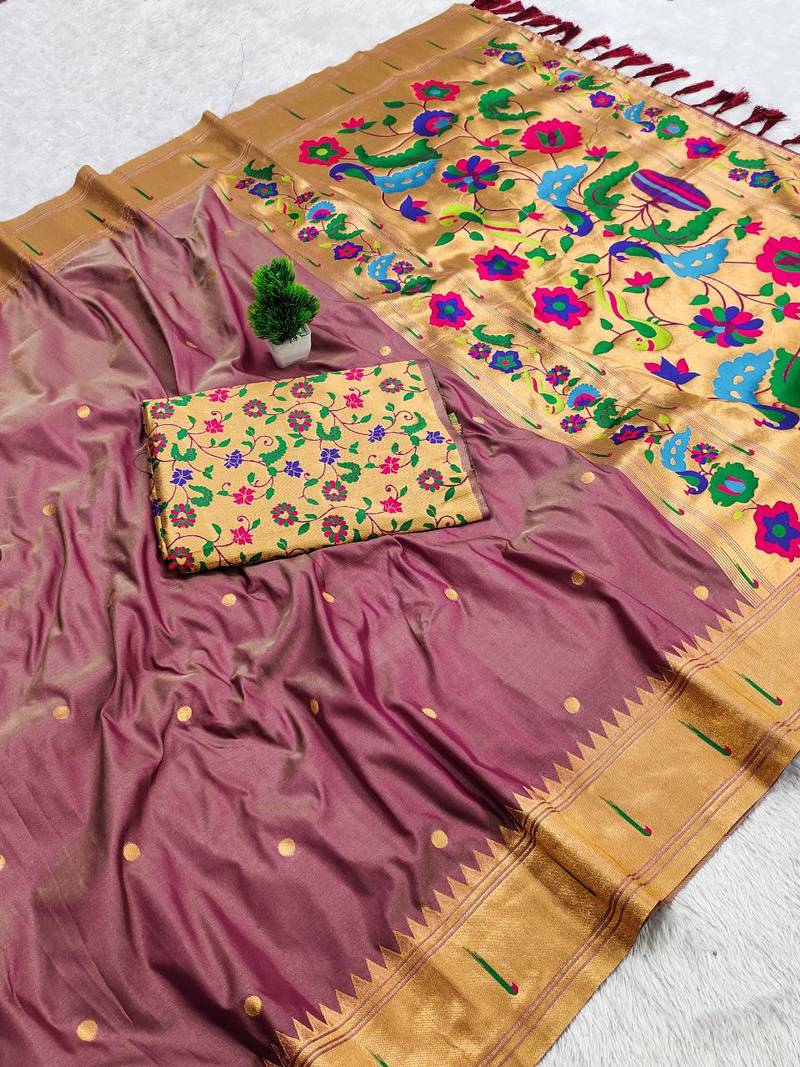Onion pink faux banarasi silk saree with paithani rich weaved pallu and blouse