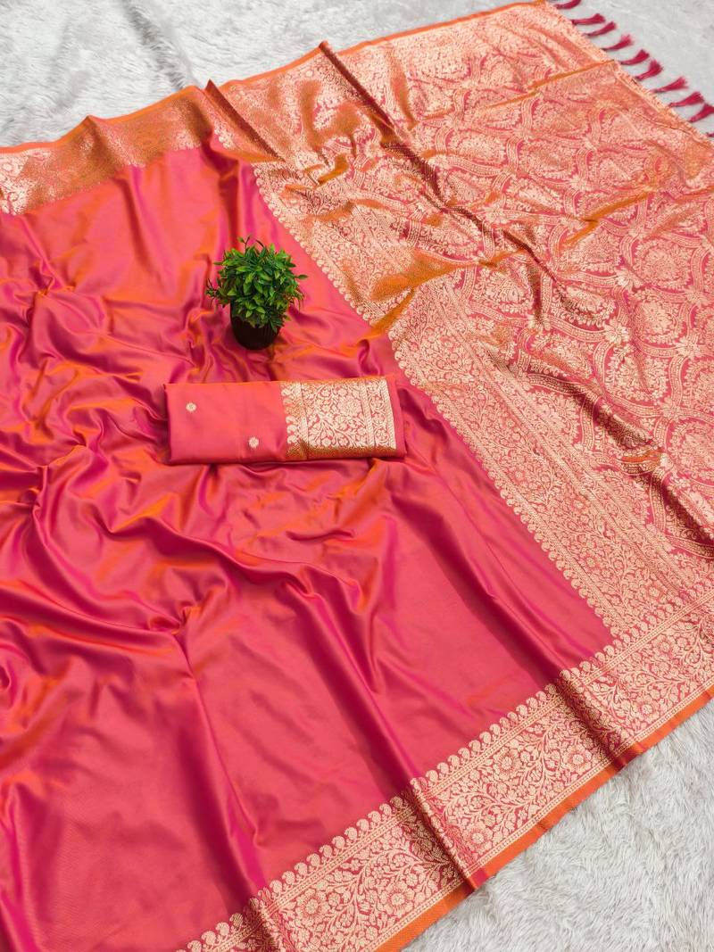 | Product Name | Peach Soft Banarasi Silk Fabric Saree With Natural Zari Weaving In Gala Border | |
