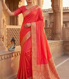 Peach soft banarasi silk fabric saree with natural zari weaving in gala border