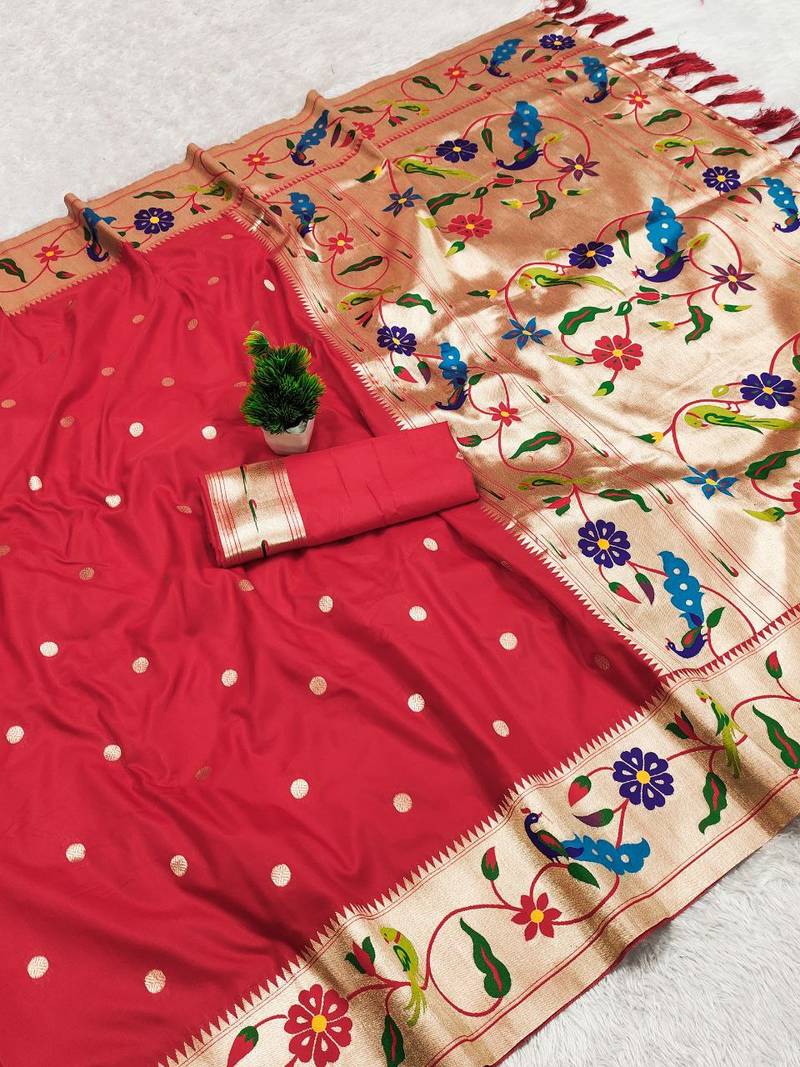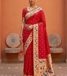 Red faux banarasi silk saree with paithani rich weaved pallu and blouse