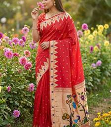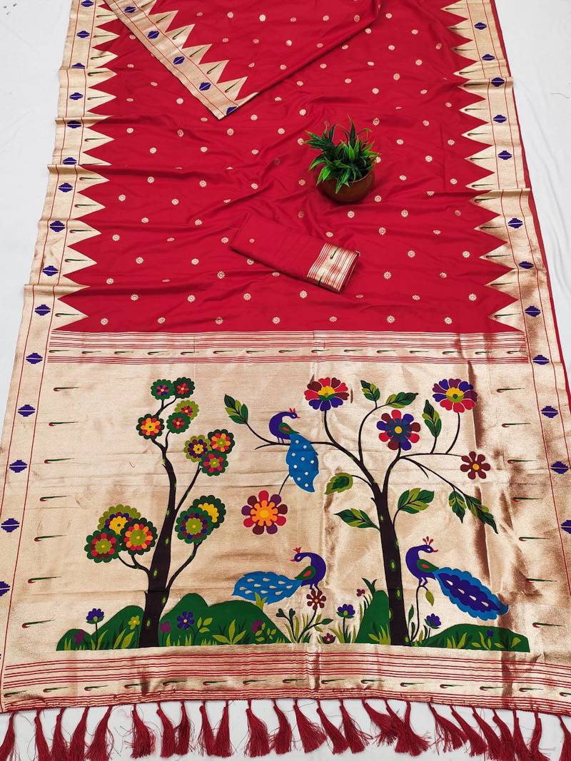 Red faux banarasi silk saree with paithani rich weaved pallu and blouse