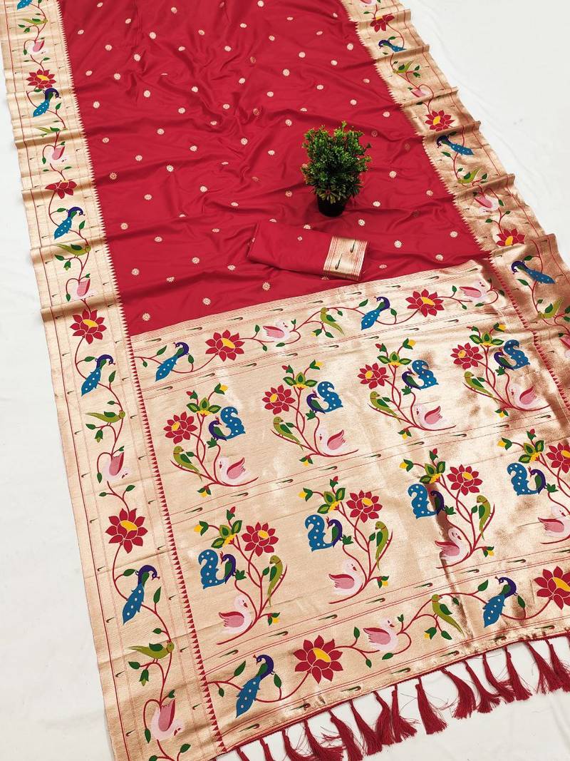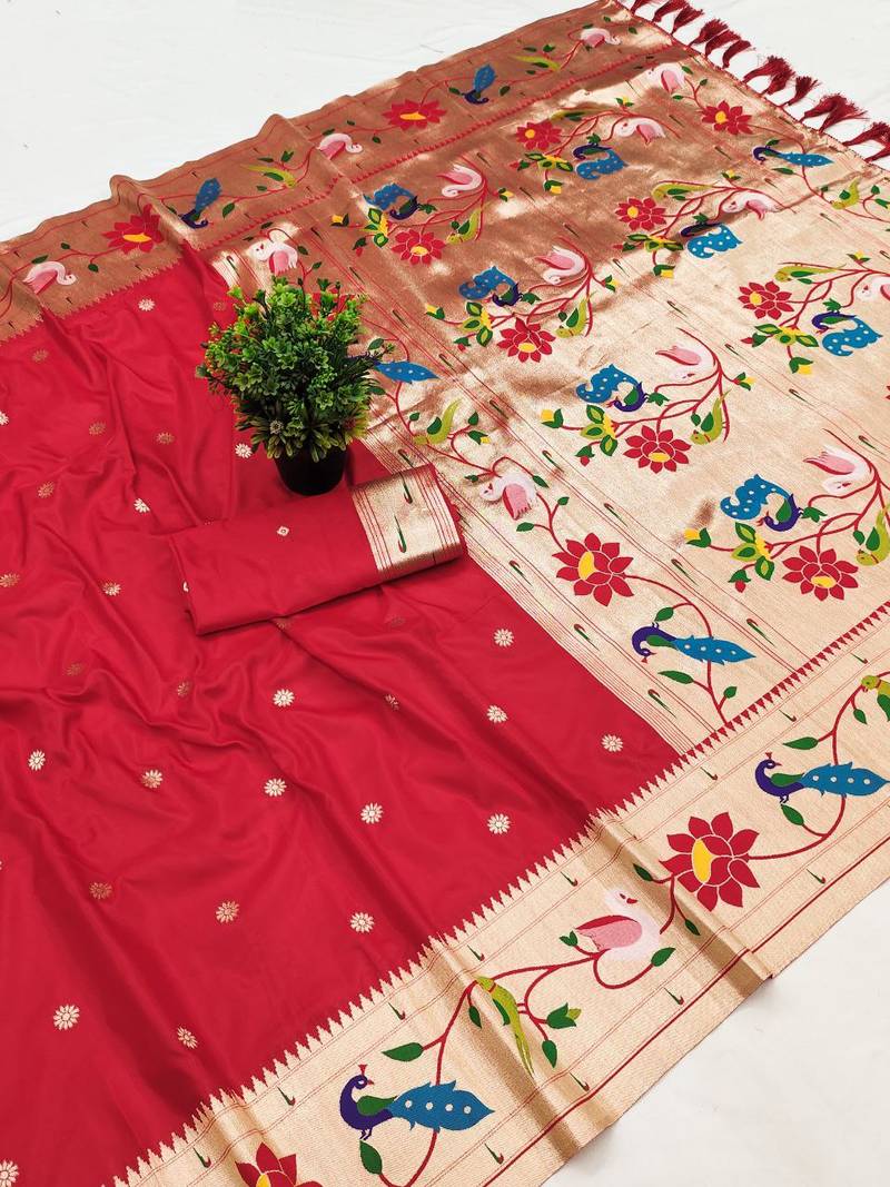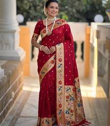 Red faux banarasi silk saree with paithani rich weaved pallu and blouse