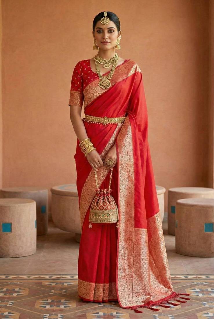 | • | Saree | : | Color- Red / Fabric- Faux Banarasi |