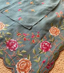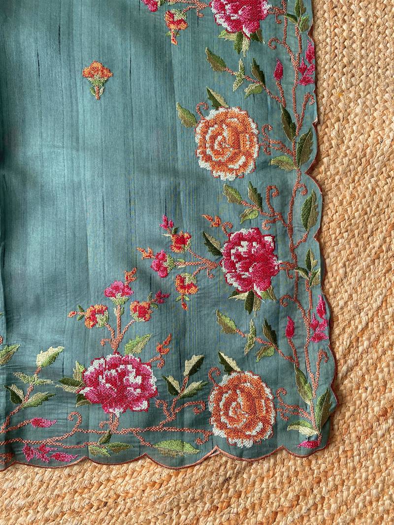 Sea green matka silk saree with heavy floral embroidery border with running blouse
