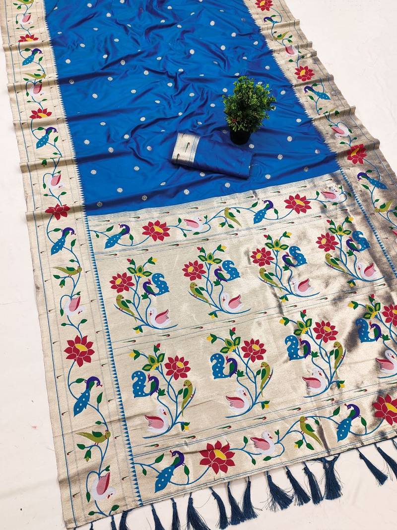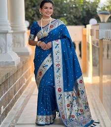 Teal blue faux banarasi silk saree with paithani rich weaved pallu and blouse