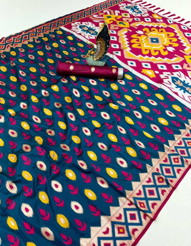 | Product Name | Teal Soft Saree With Zari Weawing Meenakari Rich Pallu And Unique Ikkat Border | |