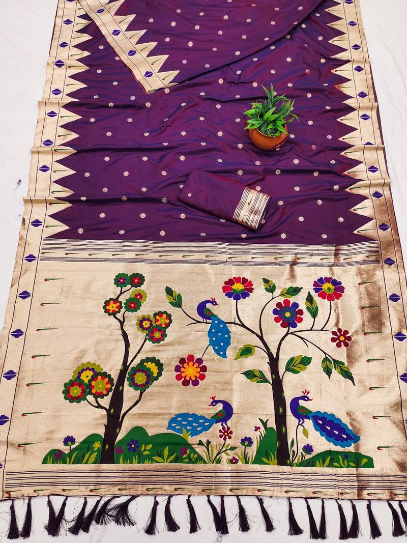 Wine faux banarasi silk saree with paithani rich weaved pallu and blouse