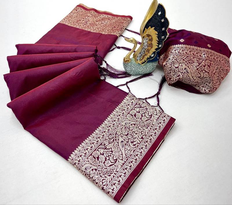 | Product Name | Wine Soft Banarasi Silk Fabric Saree With Natural Zari Weaving In Gala Border | |