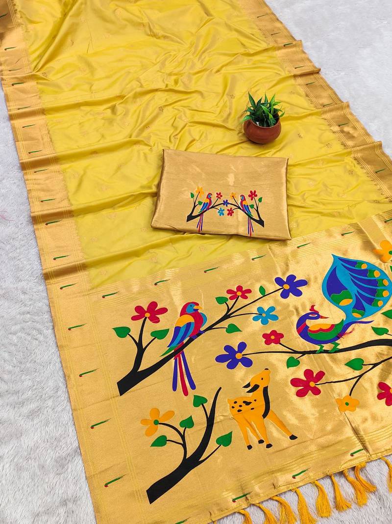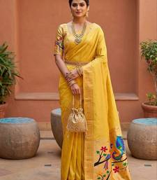 Yellow faux banarasi silk saree with paithani rich weaved pallu and blouse