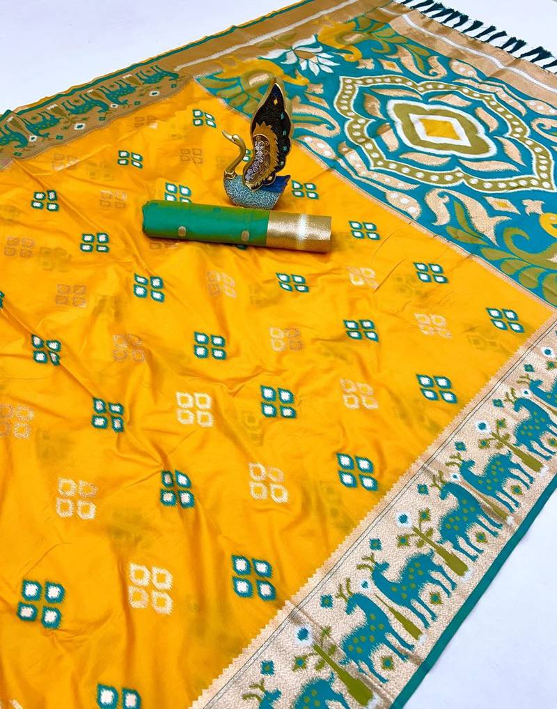 | Product Name | Yellow Soft Saree With Zari Weawing Meenakari Rich Pallu And Unique Ikkat Border | |