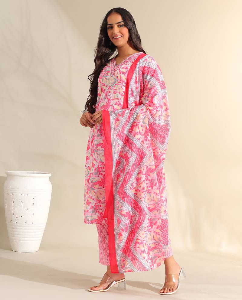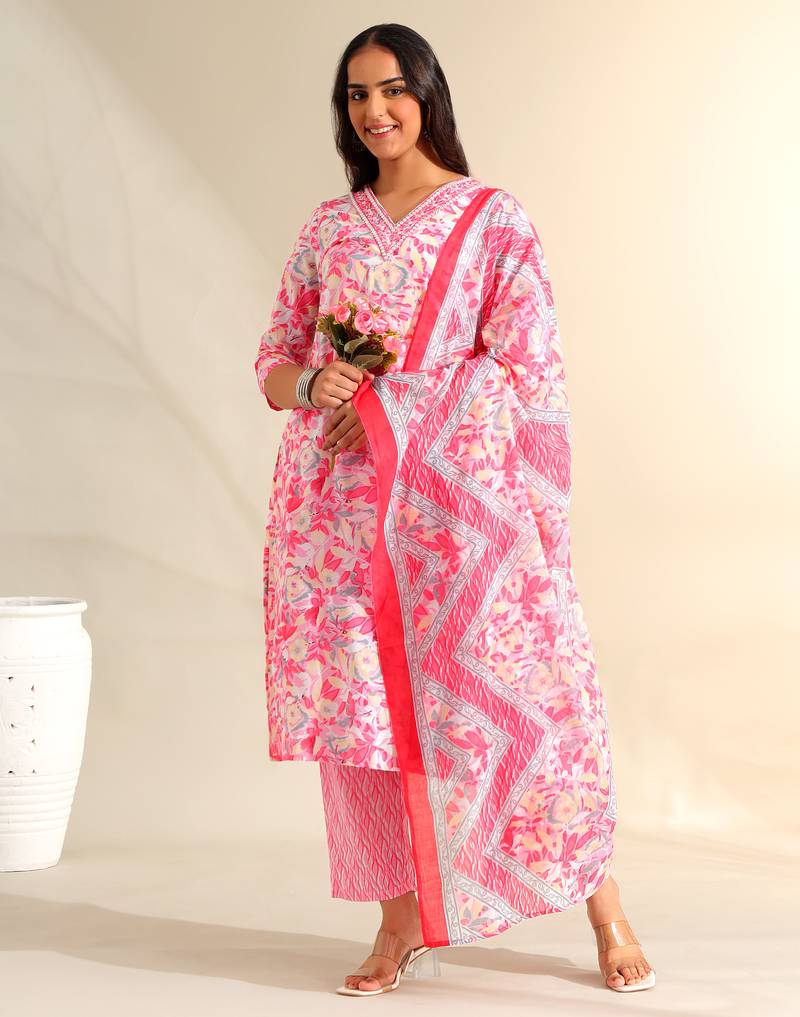 | Product Description | Step Into A Floral Fantasy With The Ahana Set, Featuring A Romantic Pink And Yellow Watercolor Floral Print Usp. This Dreamy Suit Set Is Rendered In A Soft Rosewater Pink And Lemon Yellow Palette, Adorned With An All Over Layered Botanical Floral Motif. The Kurta Is Beautifully Elevated By A V Neckline Featuring A Detailed Embroidered Border And A Shimmering Sequin Embellished Yoke, Providing A Delicate Festive Glow. The Ensemble Is Completed With Coordinating Light Pink Chevron Patterned Trousers And A Matching Lightweight Dupatta With A Bold Floral And Geometric Border, Offering A Graceful, Artistic Silhouette. |
